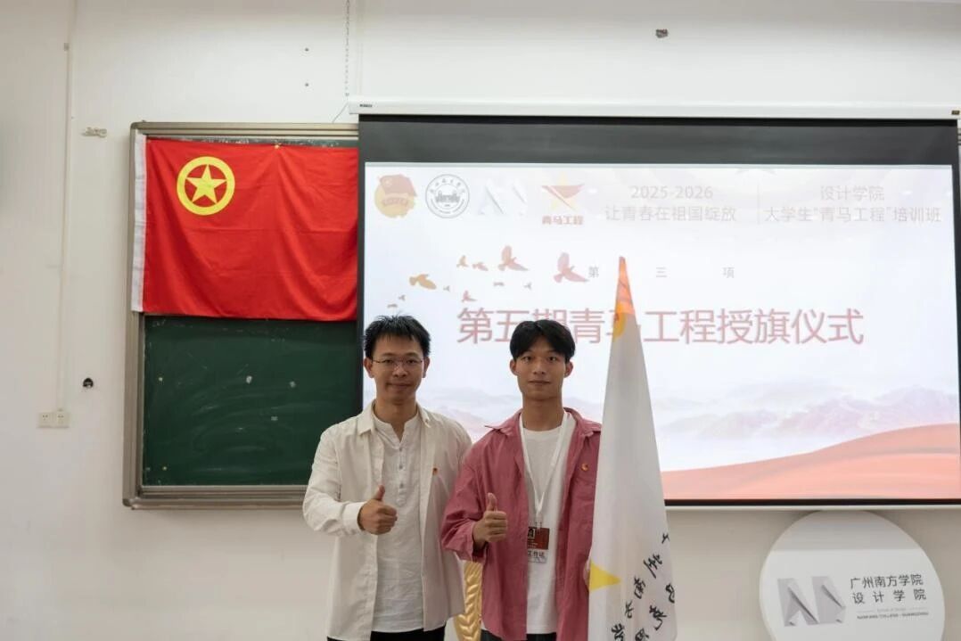 “青马工程”的授旗仪式中,廖湘老师将设计学院青年马克思主义培养工程旗帜授予第五期青马学员代表庞普坚同学,期望设计学院未来的“青马工程”在传承中创新,在实践中成长。